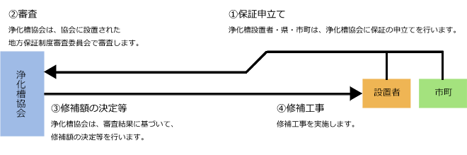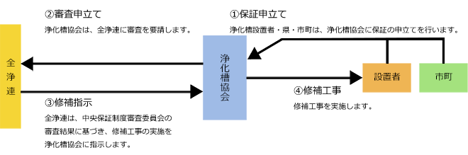 この制度は、(一社)全国浄化槽団体連合会(略称:全浄連)に保証登録された浄化槽に機能異常が発生した場合には、その原因者を明らかにして原因者による修補等の措置を確保するとともに、原因者が特定できない、また原因者により措置を講ずることが著しく困難である場合には、全浄連に設けられた保証基金により無償で修補を行うものです。