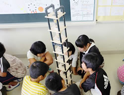 汚れた水を、ろ過タワー(協会オリジナル)を使ってきれいな水にろ過する実験を行います。